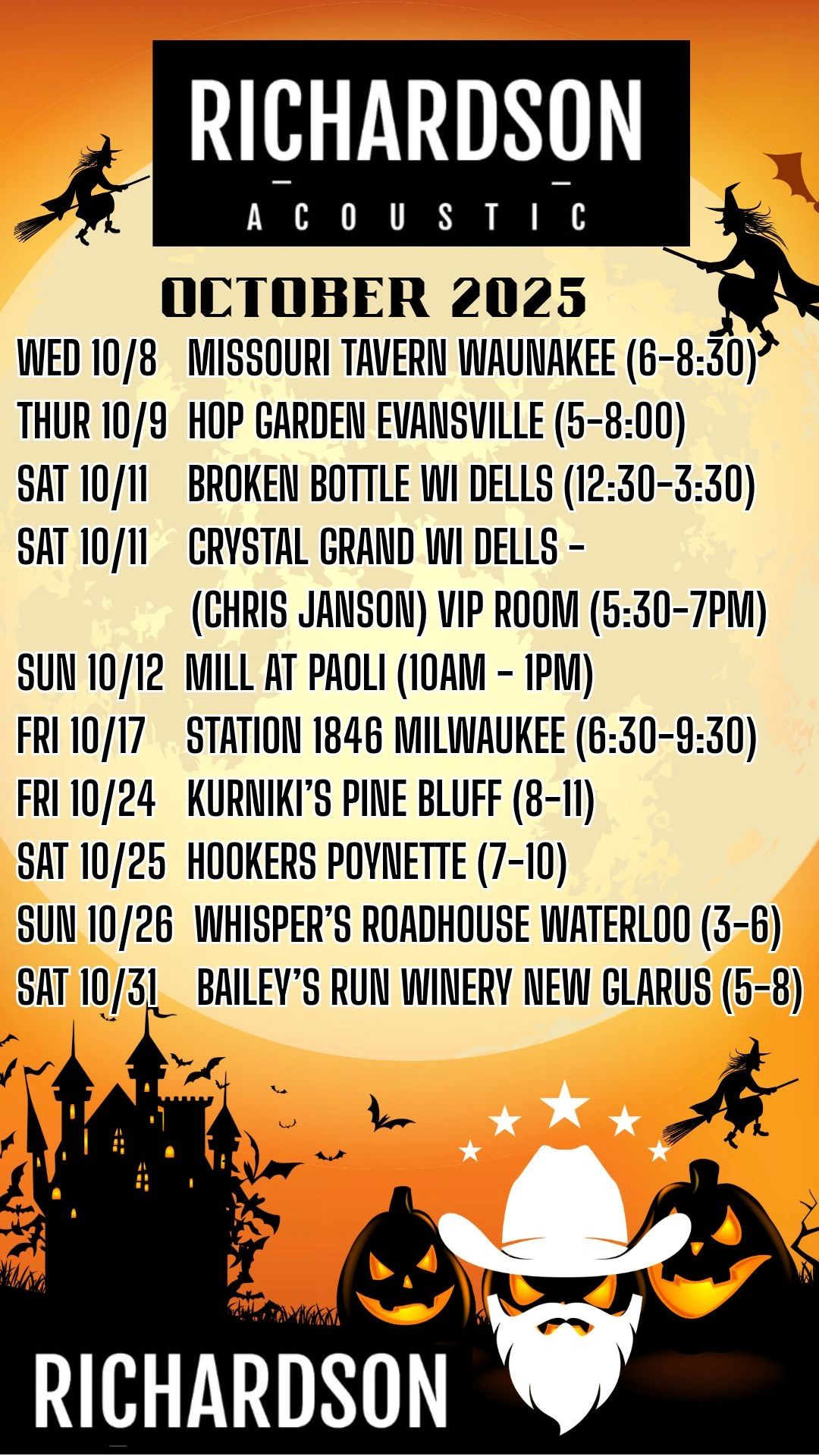 Starting in the fall of 2023 I played (10) shows and it sparked some fire from within. I know Im not great, but I don’t suck… so I figured what the hell! 😊 In 2024 Richardson Acoustic has played (88) additional performances in Wisconsin and Illinois and we have over (100) upcoming performances booked for 2025 in Wisconsin, Illinois and Ohio and we are still booking shows. Being gracious and humble are key components in my life and I am so thankful to all of our Venue partners that give me the opportunity to perform and I look forward to returning in 2025/2026. To all of my family and friends and all of those that just support local live music and put up with me making noise and dumb jokes; I thank you from the bottom of my heart and can’t wait to see you out in 2025/2026 tapping your foot, dancing and singing along (just don’t throw salt shakers 😜)