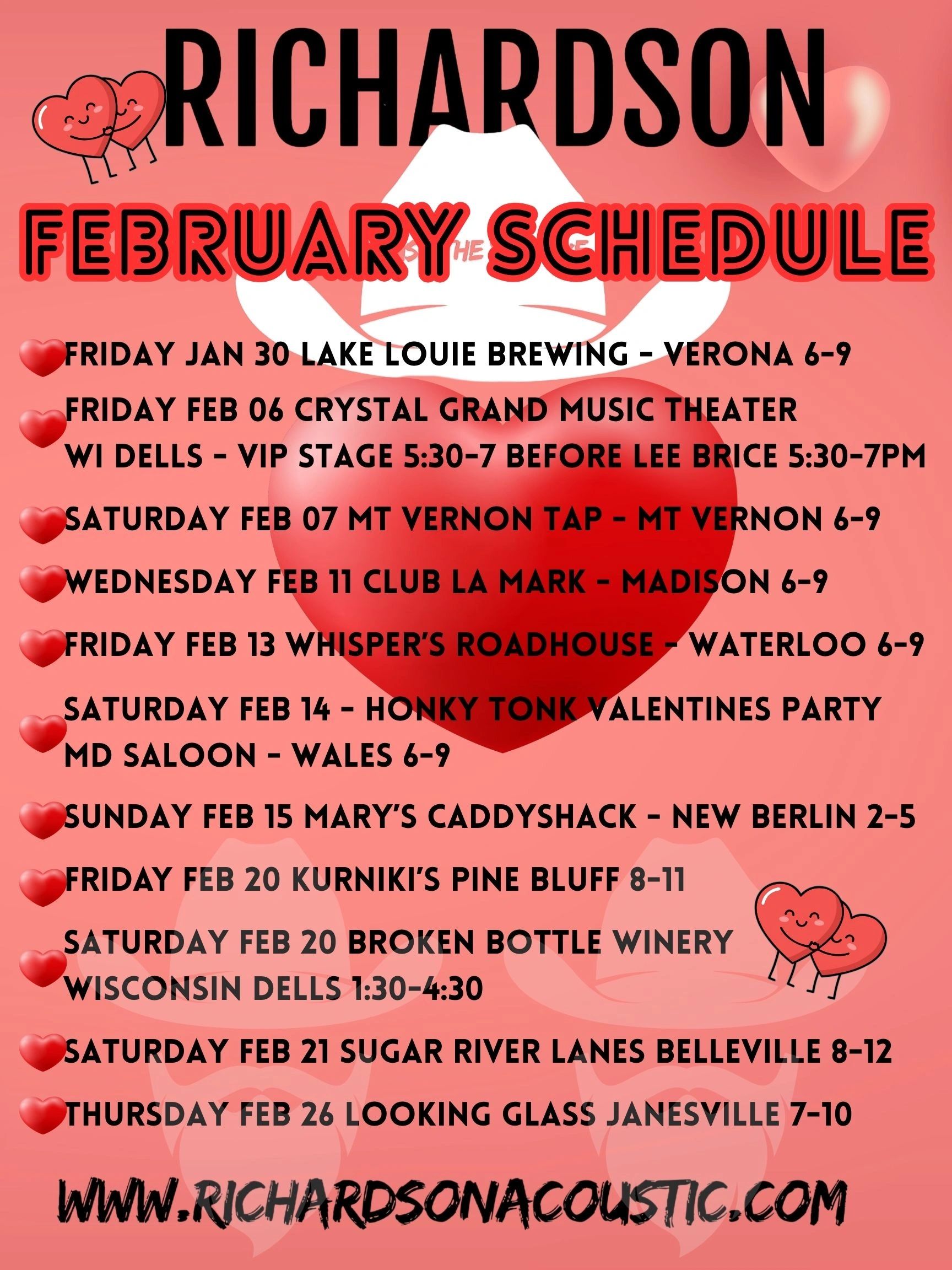 Starting in the fall of 2023 I played (10) shows and it sparked some fire from within. I know Im not great, but I don’t suck… so I figured what the hell! 😊 In 2024 Richardson Acoustic has played (88) additional performances in Wisconsin and Illinois and we have over (100) upcoming performances booked for 2025 in Wisconsin, Illinois and Ohio and we are still booking shows. Being gracious and humble are key components in my life and I am so thankful to all of our Venue partners that give me the opportunity to perform and I look forward to returning in 2025/2026. To all of my family and friends and all of those that just support local live music and put up with me making noise and dumb jokes; I thank you from the bottom of my heart and can’t wait to see you out in 2025/2026 tapping your foot, dancing and singing along (just don’t throw salt shakers 😜)